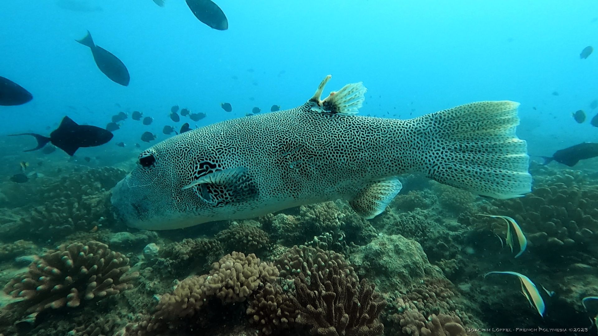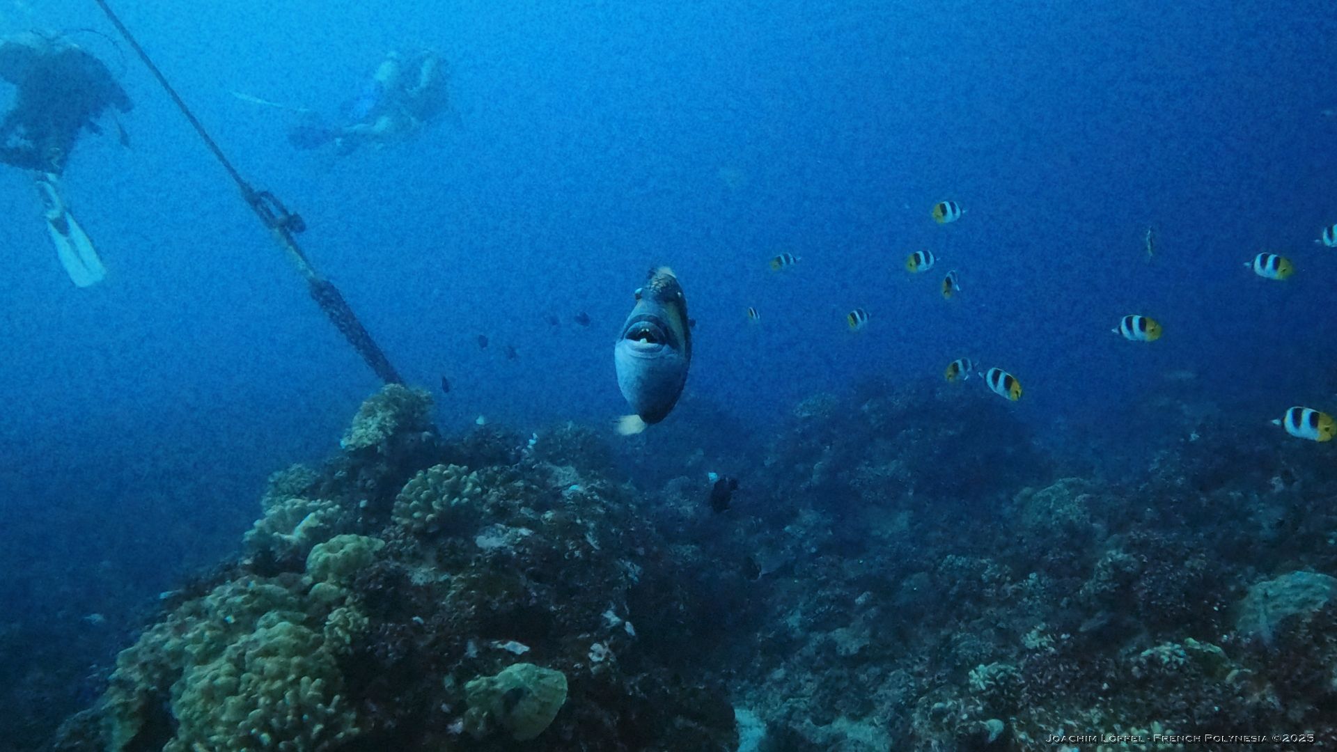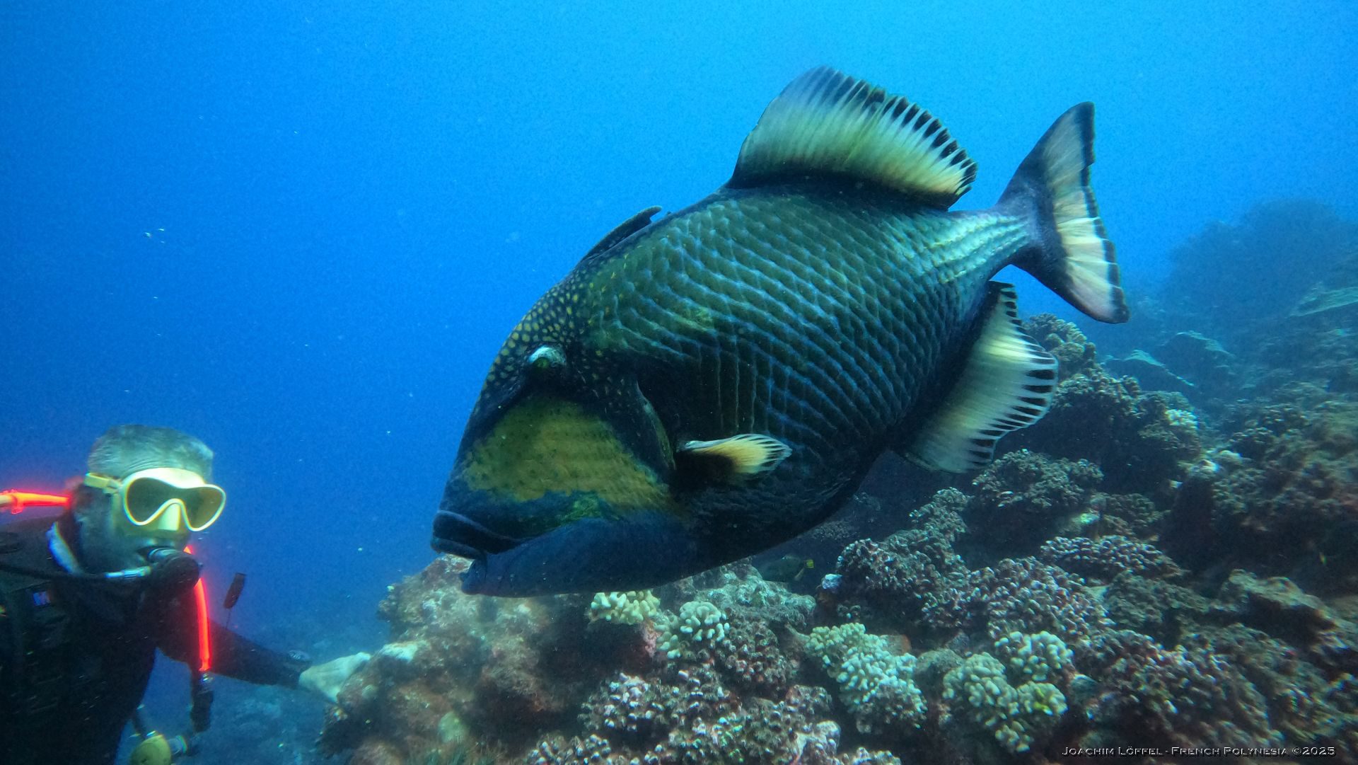 ‘Momo’ the friendly Titan Triggerfish is a permanent acquaintance for divers throughout their dive. Raised and fed by Armel, a local diver of Raiatea, he is no waiting to get his favorite treat – the crown of thorns – a real thread to coral reefs.