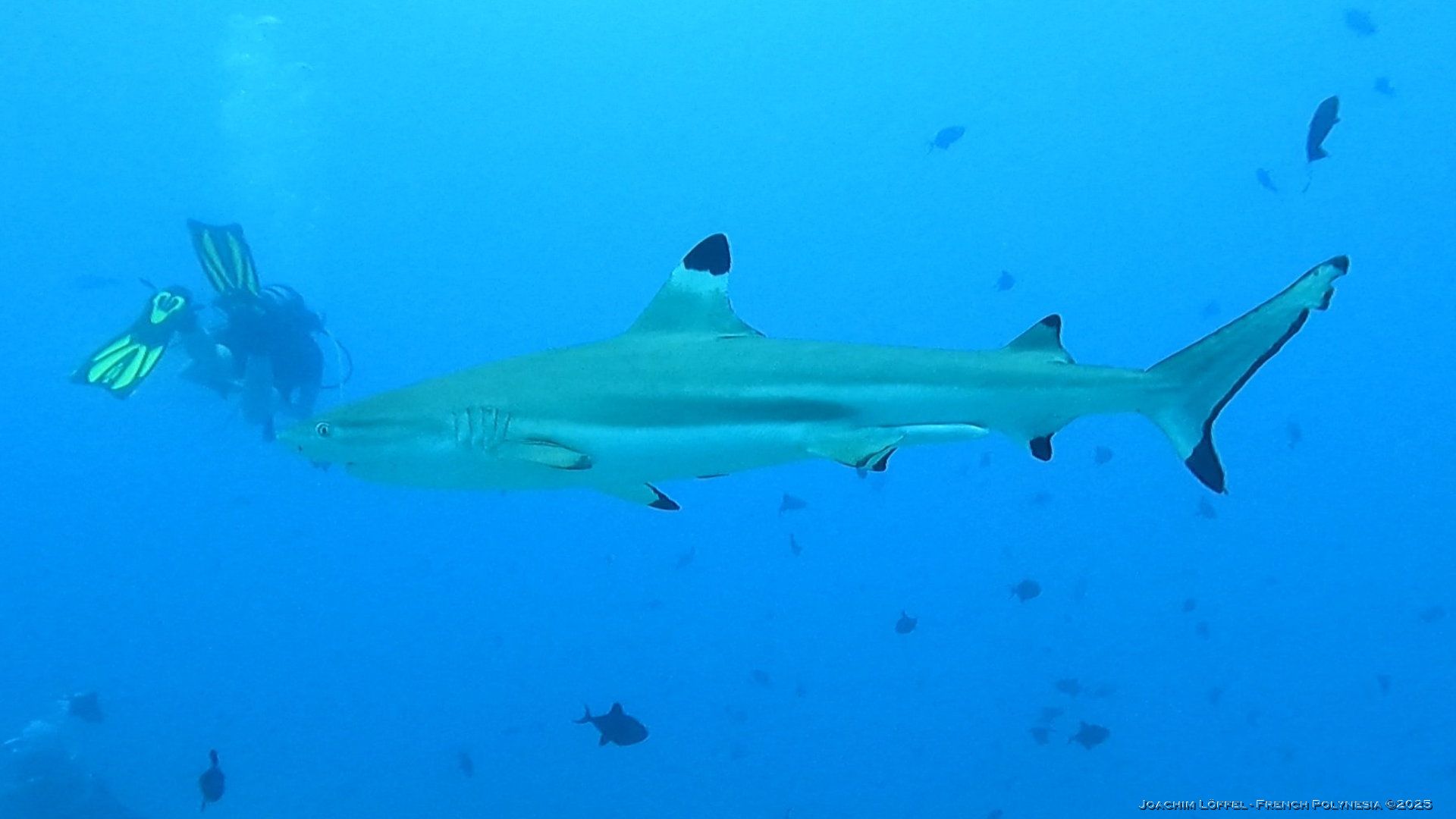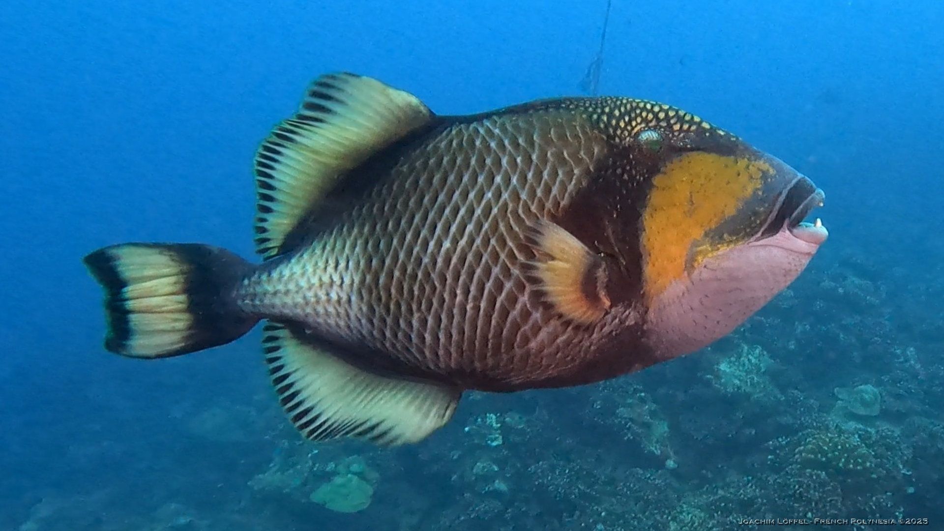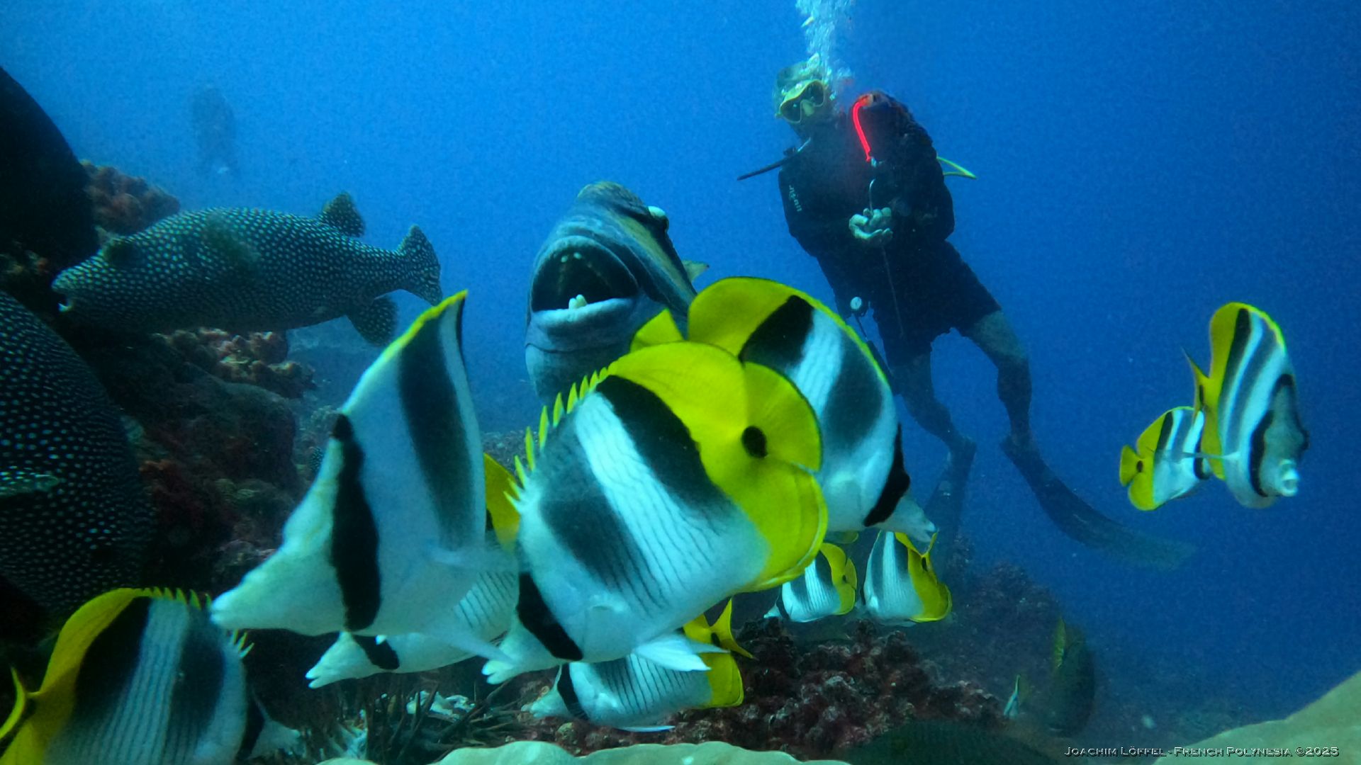 ‘Momo’ the friendly Titan Triggerfish is a permanent acquaintance for divers throughout their dive. Raised and fed by Armel, a local diver of Raiatea, he is no waiting to get his favorite treat – the crown of thorns – a real thread to coral reefs.